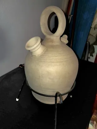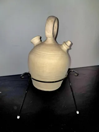 Botijo de barro tradicional, perfecto como pieza decorativa o para coleccionistas. - Material: Barro. - Color: Tono natural de la arcilla. - Diseño: Asa superior y dos picos. - Incluye soporte metálico negro.