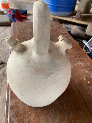Botijo de barro antiguo, ideal para decoración o uso. Es una pieza única con un diseño rústico y encantador. - Elaborado en arcilla. - Presenta un bonito color beige. - Tiene dos caños y un asa robusta.