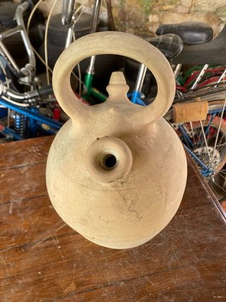 Botijo de arcilla antiguo, ideal para decoración o uso. Es de color beige claro y tiene una forma redondeada. - Asa robusta para un agarre cómodo. - Dos orificios: uno para verter y otro para beber. - Pieza única con encanto rústico.