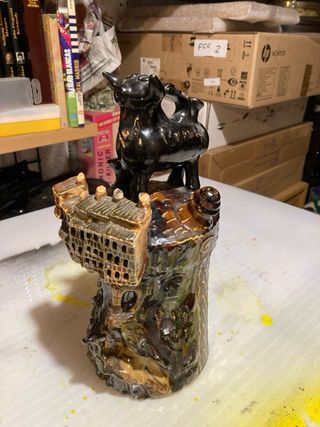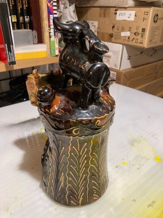 Botijo decorativo con un diseño único y llamativo. - Elaborado en cerámica. - Acabado brillante souvenir de Cuenca. - Figura de animal en la parte superior. - vintage