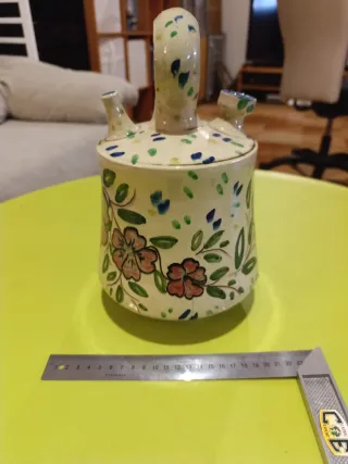Botija de cerámica con un diseño pintado a mano. - Decoración floral en tonos azules, rosas y amarillos. - Asa y tapa a juego con detalles azules. - Pitorro lateral adicional. - Útil para cocina, decoración, etc...