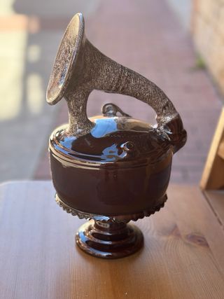 Botijo de cerámica con un diseño único, ideal para coleccionistas. - Acabado brillante en color marrón. - Detalles texturizados en la trompa y base. - Pieza decorativa con estilo. - Apto para colecciones de cerámica., años 30 ,