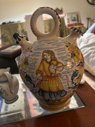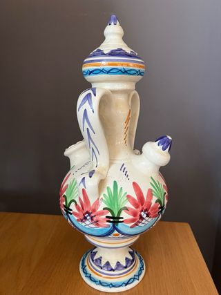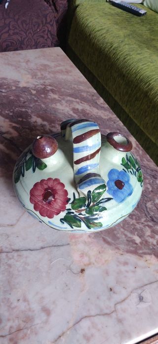 Botijo de cerámica con un diseño tradicional y decorativo. Presenta un asa superior y dos picos para servir. URGE VENDER, POR MUDANZA (MÁS COSAS EN EL PERFIL)