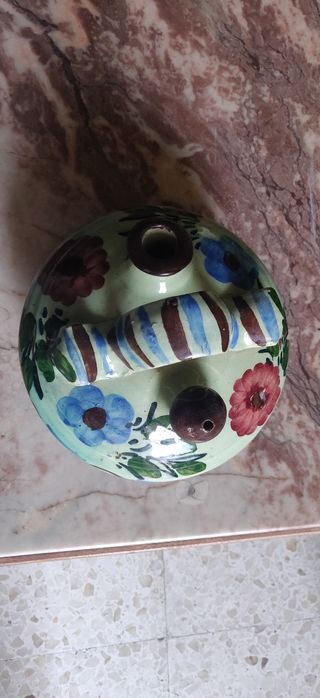 Botijo de cerámica con un diseño tradicional y colorido. Ideal como pieza decorativa. - Pintado a mano con motivos florales. - Acabado en tonos amarillos, azules y rojos. - Asa circular en la parte superior.