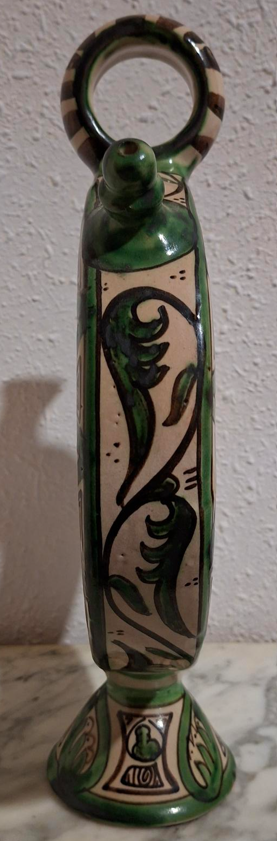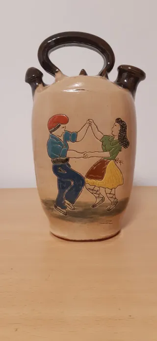 Botijo de cerámica esmaltada, decorado con una escena de baile tradicional. - Diseño pintado a mano. - Asa y picos en color marrón. - Base de color beige. - Medidas: 26 x 15 x 10 cm. - Objeto tradicional para almacenar y enfriar agua. - Ideal para decoración o coleccionistas. - La Bisbal de l'Empordà. #cantaro #cantir #botija #coleccionismo