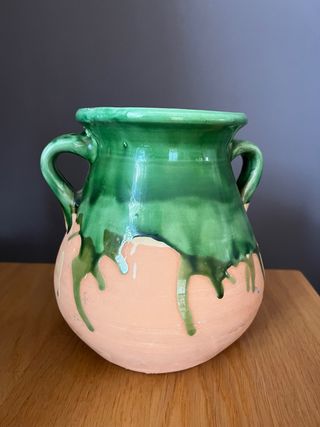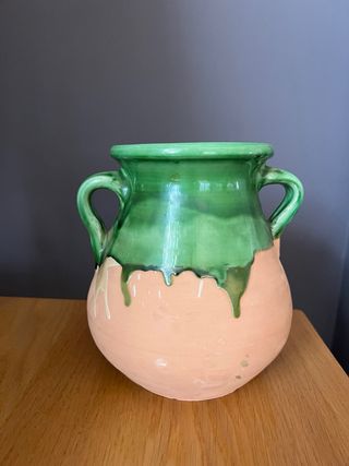 Botijo o vasija vintage de cerámica artesanal con un diseño tradicional. Presenta un acabado esmaltado en verde que gotea sobre la base de barro natural. - Material: Cerámica. - Color: Verde y terracota. - Diseño: Tradicional con asas. Medidas:Alto 19/ contorno 23