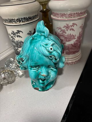 Busto antiguo de niño en color azul turquesa. - Pieza de cerámica con acabado brillante. - Detalle de expresión facial. - Forma de cabeza con elementos decorativos., tiene algunos descorches en la pintura , ver fotos , pero con una sonrisa muy tierna .