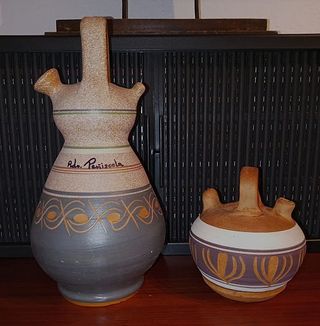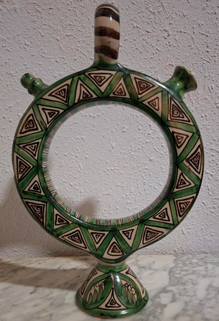 Botijo de cerámica con un diseño tradicional y decorado a mano. Presenta múltiples picos para servir. De Alfareria Arte, de Muel, Zaragoza. - Cerámica pintada a mano. - Diseño con varios picos. Altura: 27 cm Ancho de las asas: 24 cm Diámetro de la base: 13 cm Diámetro de la vasija: 17 cm NO SE ENVIA. SE RECOGE EN L'HOSPITALET