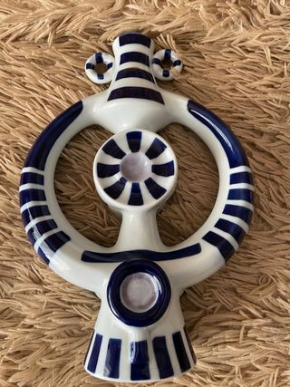 Vendo botijo de cerámica antiguo con un diseño tradicional en azul y blanco. Presenta un asa y dos picos y está pintada a mano, con motivos florales y geométricos. Mide 30cm de alto x 20cm de ancho aproximadamente. Se encuentra en buen estado, tal y como se observa en las fotografías. Otros artículos de interés en mi perfil. Hago precio especial pack. Interesado/as no dudéis en contactarme!