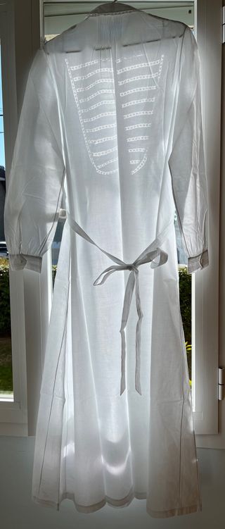 Antiguo camisón de algodón, de manga larga,con filigrana de puntilla y tablillas. También tablillas en la espalda y puños. Lazo para atar en la espalda Botones de nácar