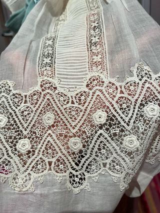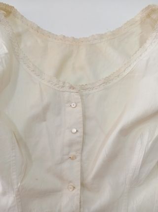 Delicado corpiño de inspiración eduardiana/victoriana, confeccionado con un cuidado exquisito en los detalles. Presenta mangas cortas abollonadas rematadas con encaje inglés festoneado, un elegante escote cuadrado con encajes y cierre frontal con botones de nácar originales. La zona inferior incorpora pliegues suaves que aportan estructura y feminidad a la silueta. Una pieza especial, romántica y atemporal, ideal para amantes de la moda histórica o para estilismos vintage únicos. Talla: S (pequeña)