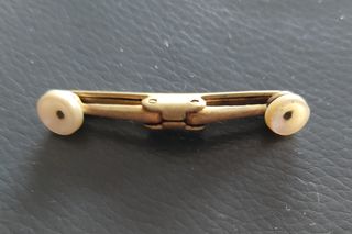 Antiguo trabacuellos de metal dorado y botones de nácar. Marca Victorina, con número de patente. Mide 4,5cm de largo.