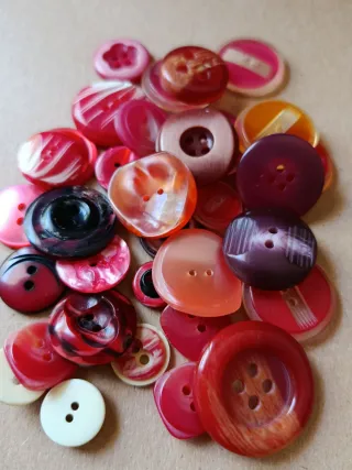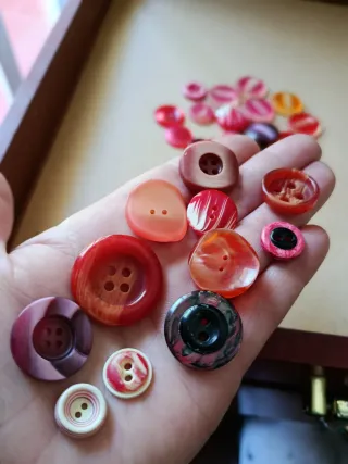 Conjunto de botones antiguos y vintage en diversas tonalidades del rojo.Cada pieza tiene un diseño único. ( Los coleccionaba mi abuela ) - Variedad de tamaños y formas. - Materiales diversos como nácar, resina, etc... - Diseños que evocan épocas pasadas.