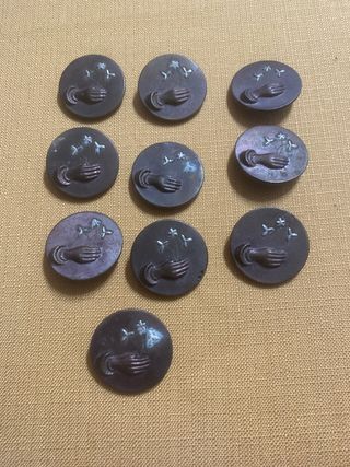 Lote de 10 Botones de metal antiguos, con relieve, de mano sujetando ramo flores, 32mm de diametro, con signos de desgaste, precisa algún retoque.