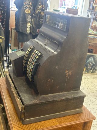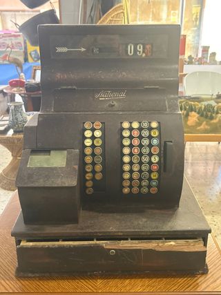 Esta es una antigua caja registradora de la marca National. - Diseño clásico y robusto. - Teclado con botones numéricos y alfanuméricos.