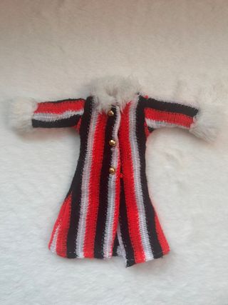 Abrigo de rayas rojas, negras y blancas con detalles de pelo y botones dorados. Le falta el cinturón y dos clips de cierre. El punto no está perfecto debido a sus años. 👉🏻Cada muñeca antigua o de segunda mano, así como sus complementos, tienen su propia historia, y con ella pueden aparecer señales del tiempo. En mi perfil solo hay piezas vintage, si se desea un artículo nuevo y sin uso, la mejor opción es adquirirlo en su embalaje original en otro perfil o comercio. #barbievintage