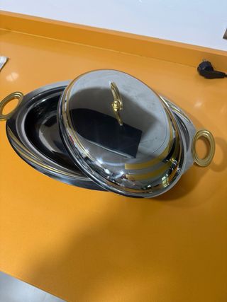 Elegante bandeja ovalada con detalles en baño de oro. Perfecta para servir o como pieza decorativa. - Diseño ovalado. - Acabado en metal plateado. - Adornos en baño de oro.