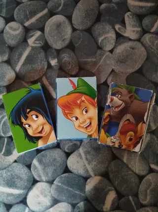 Pack de tres juegos de cartas de Disney, marca Fournier. Incluye personajes clásicos de Disney. - Tres juegos de cartas: el libro de la selva, Peter Pan y Disney animal friends. 33 cartas cada uno - Marca Fournier. -Las cajas están algo desgastadas (la de animal friends está rota) pero las cartas están en muy buen estado. (Ver fotos)