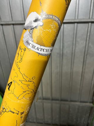 Mapa de rascar para descubrir el mundo. Ideal para planificar viajes o recordar destinos visitados. - Diseño con mapa del mundo. - Superficie para rascar y revelar detalles. - Incluye nombres de ciudades como Chicago, Boston, Nueva York, Winnipeg y Thunder Bay.