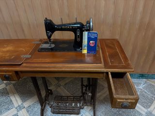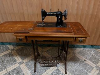 Máquina de Coser completa con su mueble original de madera y pedal de hierro fundido. Muy buen estado general. La máquina coser funciona perfectamente( la correa funciona pero sería mejor cambiarla).El mueble presenta el desgaste normal de los años, manteniendo su belleza original. Incluye el Libro de Instrucciones y Piezas Catalogadas original