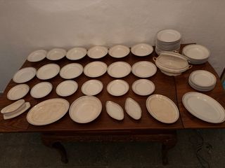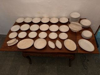 Completa vajilla antigua de la prestigiosa fábrica de Loza La Asturiana. Piezas originales marcadas con el sello de "La Asturiana Gijón" Como es habitual en la loza antigua, algunas piezas presentan el fenómeno de craquelado. Conjunto de piezas: Platos Hondos 12 Platos Llanos 24 Platos Chicos 12 Sopera 1 Salsera 1 Ensaladera 1 Fuente grande 1 Fuente mediana 1 Fuente pequeña 1 Platitos auxiliares decorativos 2 Total: 51 piezas