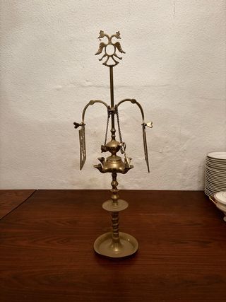 Antiguo candelabro de aceite fabricado en latón. Presenta un diseño elaborado con detalles ornamentales. - Base circular. - Cuerpo central con múltiples niveles. - Dos brazos laterales. - El cuerpo central presenta de forma prominente el Águila Bicéfala, un símbolo histórico asociado con el Imperio Bizantino, la Iglesia Ortodoxa Griega, la Iglesia Ortodoxa Rusa y varias casas reales europeas.