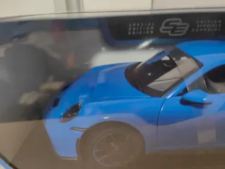 Réplica del Porsche 911 GT3 en color azul, edición especial. Porsche 911 GT3 azul de edición especial fabricado por Maisto, probablemente el modelo de 2022 a escala 1:18. Información del Producto Marca: Maisto Modelo: Porsche GT3 (generación 992, modelo 2022) Color: Azul (a menudo llamado "azul tiburón" en el modelo real) Edición: Special Edition (Edición Especial) Escala: Comúnmente disponible en escala 1:18 o 1:24. Las fuentes sugieren que este en particular es probablemente 1:18, que tiene una longitud aproximada de 26 cm. Material: Fabricado en fundición a presión (diecast) con piezas de plástico.