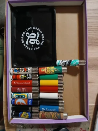Conjunto de mecheros Clipper con diferentes diseños y una bandeja. - Bandeja negra con logo The Green Brand. - Diseños variados en los mecheros, incluyendo marcas como Caixa de Sabadell y Pall Mall. - Un mechero con diseño de Banesto. - 2 bad day - 2 con funda