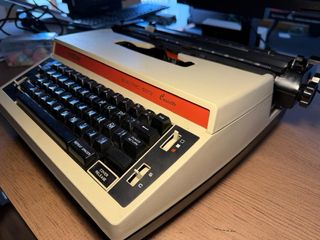 Máquina de escribir electrónica Brother modelo 5512. - Diseño en color beige con detalles en rojo. - Teclado QWERTY completo. - Palanca de avance de carro. - Botones de función como TAB, POWER RETURN, REPEAT SPACER y COVER RELEASE.
