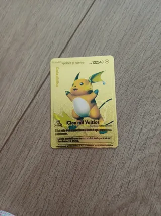Carta Pokémon Raichu dorada, con un diseño especial y brillante. - Carta atlética. - Ataque Cien mil Voltios. - PS 132540. - Edición especial Super dragón que escupe fuego. - Incluye texto en español.