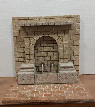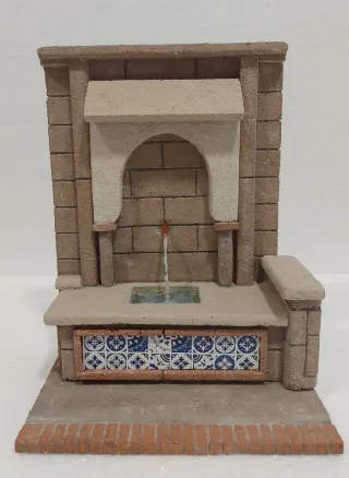 Preciosa fuente artesanal, ideal para belenes o dioramas,ancho 23cmt,alto 29cmt y fondo 15cmt. - Diseño inspirado en fuentes tradicionales. - Acabado en ladrillo y azulejos decorativos. - Incluye un pequeño surtidor de agua.