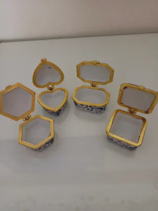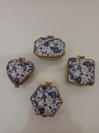 Conjunto de cuatro pequeñas cajas decorativas de cerámica con un diseño floral. - Diseño floral azul y blanco. - Bordes dorados. - Formas variadas: corazón, octogonal, cuadrada y hexagonal.