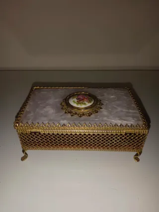 Elegante joyero vintage con detalles metálicos dorados y un diseño intrincado. LE FALTA EL ESPEJO DE LA TAPA. - Tapa con acabado nacarado y medallón decorativo. - Laterales de rejilla metálica. - Patas curvas doradas.