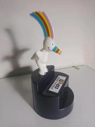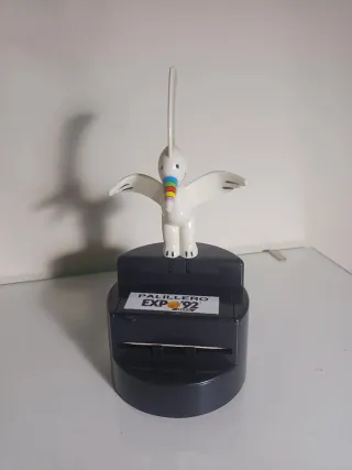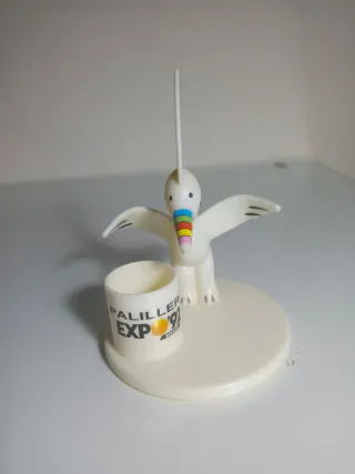 Original palillero de Curro, la mascota de la Expo'92 de Sevilla. Un recuerdo único de este evento. - Diseño de pájaro blanco con arcoíris. - Base negra con el logo de la Expo'92.