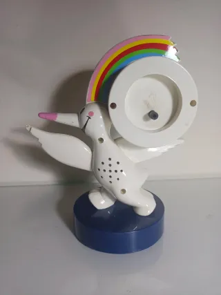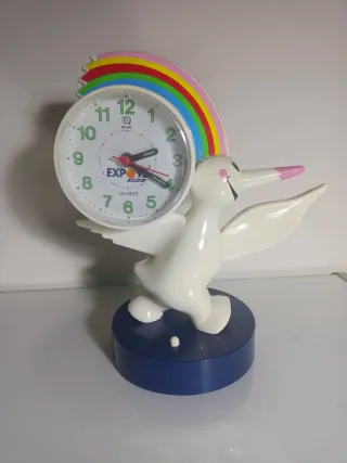 Despertador vintage con diseño de Curro, la mascota de la EXPO'92. HAY QUE SOLDAR LOS CABLES - Figura de Curro en color blanco. - Base de color azul. - Detalle de arcoíris en la parte superior.