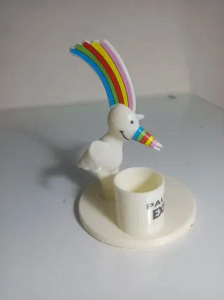 Original palillero de la Expo 92 de Sevilla, con el personaje Curro. - Diseño divertido con Curro y un arcoíris. - El palillero es un pequeño vaso blanco. - El pico de Curro tiene los colores del arcoíris.
