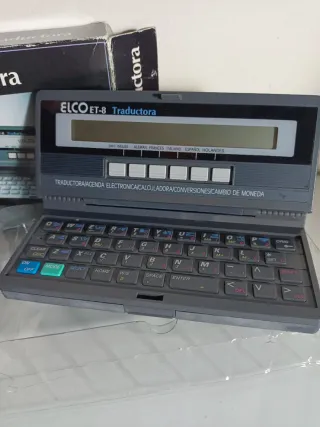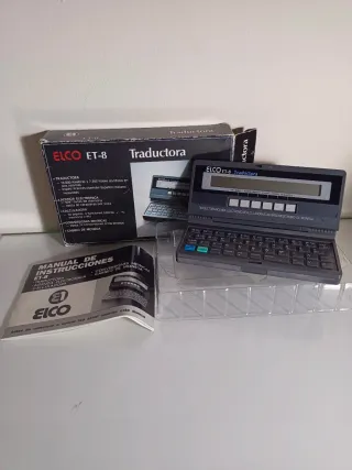 Traductor electrónico ELCO ET-8 con múltiples funciones. - Traductor de 18.000 palabras y 7.200 frases en 6 idiomas. - Agenda electrónica con 5097 bytes de memoria. - Calculadora con 4 funciones básicas y memoria. - Conversiones métricas y cambio de moneda.
