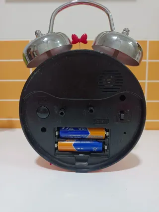 Despertador con diseño de Minnie Mouse de Disneyland Paris. Ideal para habitaciones infantiles. - Base roja con lunares blancos. - Figura de Minnie Mouse en la esfera. - Dos campanas metálicas superiores. - Pequeño lazo rojo decorativo. Le falta la tapa de las pilas.