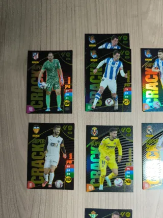 Lote de cromos de la colección Super Crack 2019-20. - Incluye el cromo Tridente con varios jugadores. - Cromos de jugadores como Parejo, Costa, Guedes, Gameiro, Reguilón, Kroos y Borja Iglesias. - Algunos cromos son Super Crack y Nuevo. - Las cartas muestran estadísticas de los jugadores.