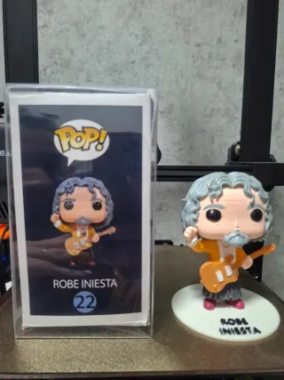 Figura Funko Pop de Robe Iniesta, vocalista de Extremoduro. Representa al artista tocando la guitarra. - 🌸Figura en 3D y pintado a mano. - 🌸Base blanca con el nombre del artista. - 🌸Incluye caja personalizada y protector.