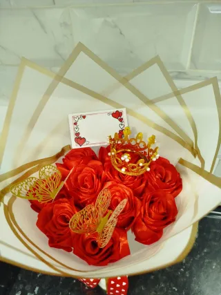 Precioso ramo de rosas rojas eternas, perfecto para regalar o decorar. 10 rosas eternas por pedido el color de su preferencia - Rosas de tela satinada en color rojo intenso. - Adornado con mariposas doradas. - Incluye una pequeña corona dorada con perlas. - Tarjeta para dedicatoria.
