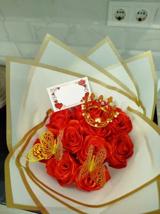 Precioso ramo de rosas eternas, ideal para regalar. Puede elegir el color que te gusta incluye corona , mariposas y más detalles. Su consulta es bienvenida. En mi perfil hay más modelos. - Flores de tela en color rojo intenso. - Decorado con mariposas plateadas. - Corona plateada en la parte superior. - Lazo rojo con texto. - Envuelto en papel blanco.