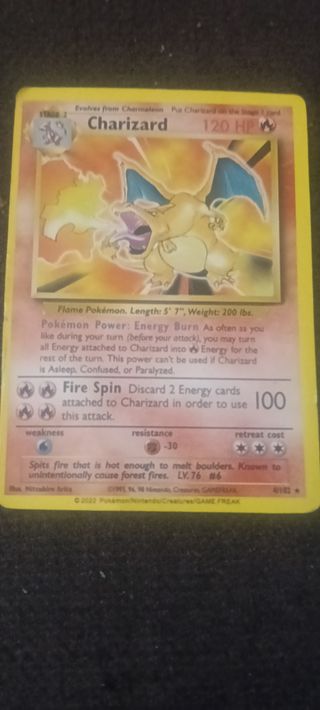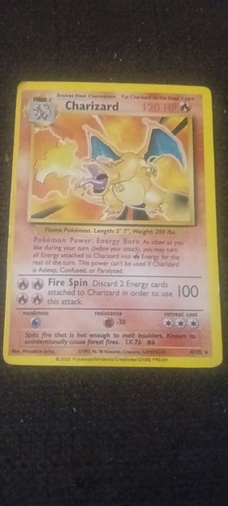 Carta de Pokémon de Charizard, Stage 2. - Ataque: Fire Spin - Poder: Energy Burn - Resistencia: -30 - Coste de retirada: 3 - Número de carta: 4/102
