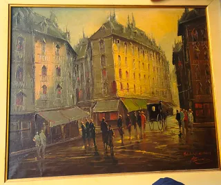Pintura al óleo de una escena urbana, posiblemente de París, firmada por Rodríguez y datada en 1904. - Representación de edificios con arquitectura clásica. - Figuras humanas y un carruaje en la calle. - Tonos cálidos y atmósfera de época. Precio a convenir, llamar a 646017625