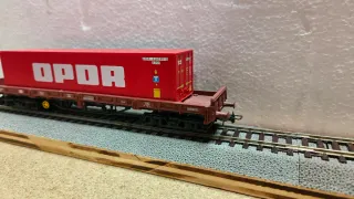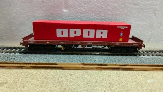 Vagón portacontenedor de la marca Electrotren. El vagón lleva incorporado contenedor rojoOPOR - Vagón de mercancías. - Contenedor de carga. - Diseño detallado.