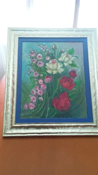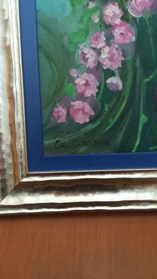 Precioso cuadro pintado al óleo por el artista Carlos Santiesteban. Representa un ramo de flores variadas en tonos rosas, blancos y rojos, con un fondo azul verdoso. - Firmado por el artista. - Marco dorado incluido. Escuchó ofertas serias. Cuadro original