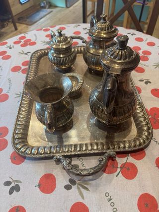 Elegante juego de té o café en Alpaca Plateada. Incluye cafetera, tetera, azucarero, lechera, colador con recogido y bandeja con asas. - Diseño clásico y detallado. - Piezas con acabados ornamentados. - Ideal para complementar tu vajilla. - Ideal tanto para uso como para decoración. - Material exterior en alpaca plateada e interior de acero inoxidable, práctico y duradero. - Muy bien conservado, sin golpes ni piezas faltantes. - No se admiten devoluciones.
