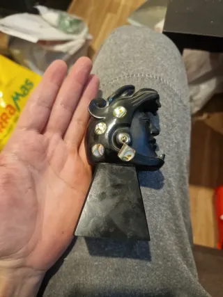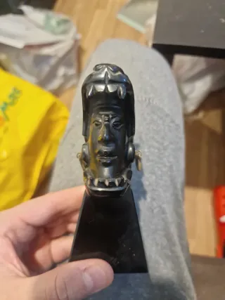 Figura decorativa de una cabeza tallada en obsidiana. Presenta detalles en la cabeza con incrustaciones de nácar. - Material: Obsidiana. - Diseño: Cabeza con tocado. - Adornos: Incrustaciones de nácar.