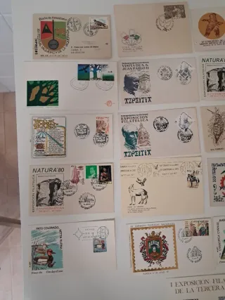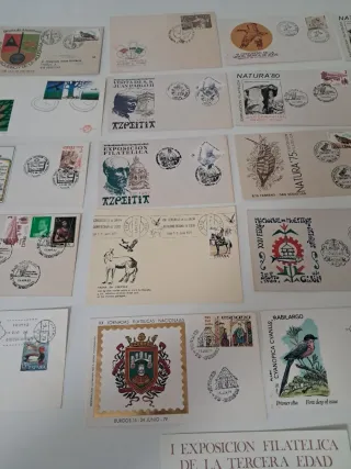 Lote de 21 sobres de Primer Día de diferentes emisiones y temáticas. - Sobres de exposiciones filatélicas. - Temáticas variadas: naturaleza, historia, personajes. - Incluye sobres de Natura '80, XX Jornadas Filatélicas Nacionales, Braña de Aristebano, Visita de S.S. Juan Pablo II, entre otros. - Todos los sobres, incluyen sellos y matasellos. - Ideal para coleccionistas de filatelia.
