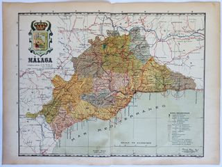 Antiguo mapa de la provincia de Málaga (Andalucía) del año 1901. Procedente del 'Atlas Geográfico de España" elaborado por Manuel Escudé Bartolí y editado en 1901 por Alberto Martín en Barcelona. Medidas: 37 x 49 cm. Mapa a doble página con reverso en blanco. Buen estado, ligeramente amarillento por los más de 120 años transcurridos desde su edición. Artículo ORIGINAL de 1901!! no es copia ni reproducción posterior. Agrupo envíos.